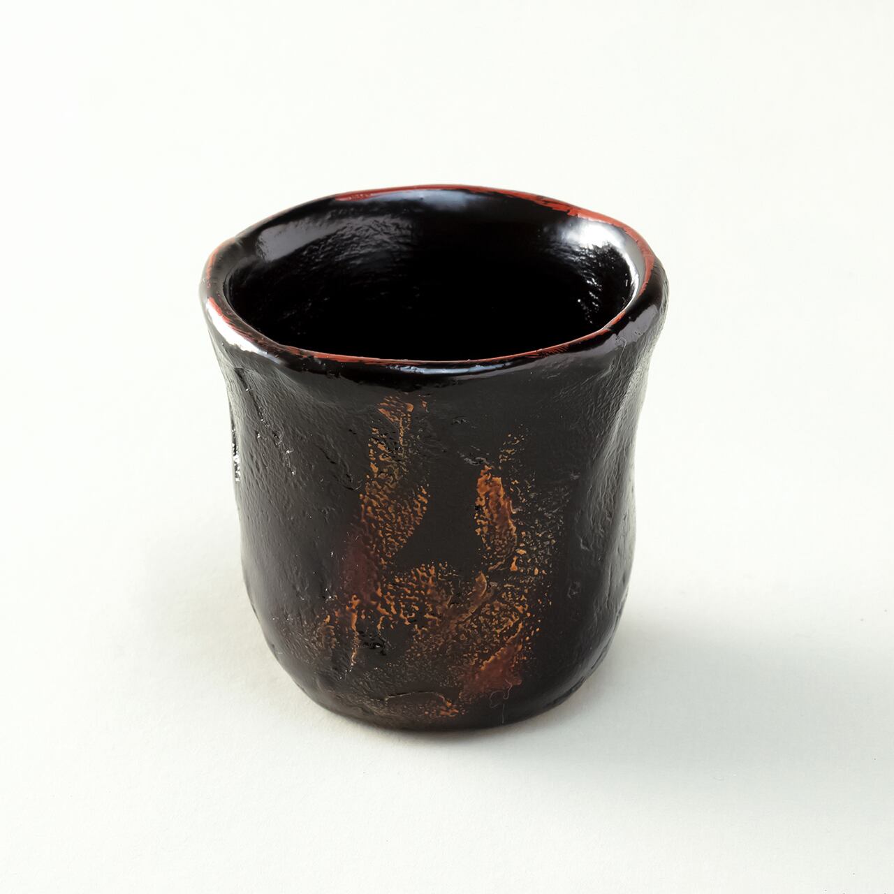 ろくろで挽いた木地に、下地として地の粉と漆を混ぜた錆をヘラと手で付け、まるで陶器と思わせる様な大変丈夫な木製のぐい吞